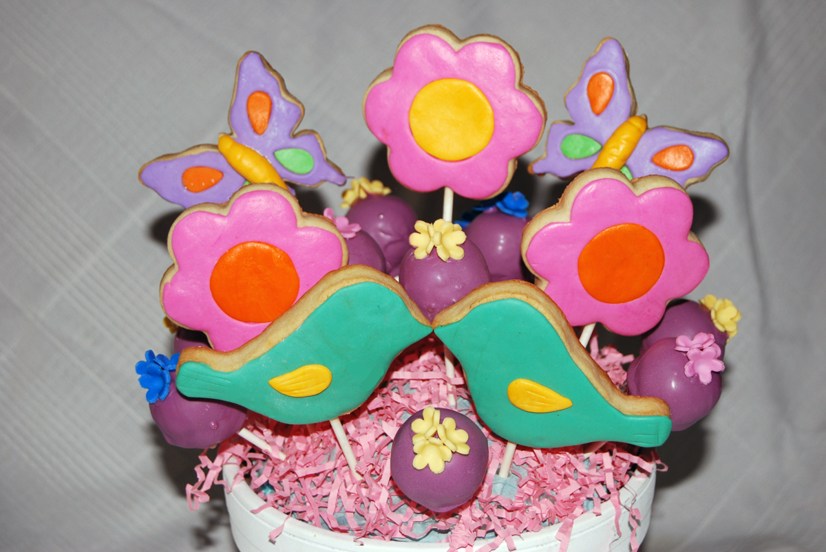 This bouquet screams out Spring in a very "sweet" way! I thought it was a great idea to pair the cookies up with delicious red velvet and cream cheese buttercream icing pops covered in white chocolate that I tinted in lavender. I also added little flowers to the pops to make them look good with the rest of the cookies. This is a great bouquet, for your sweetheart on Valetine's, Mother's Day or just because! I also made some simple red velvet balls that are great for any dessert table or to give as a gift as well.